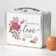Eine elegante Lunchbox mit Blumenmotiv mit niedlichen kleinen Vögeln und Liebe-Schrift. Schöne für Schule oder Büro.