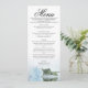 Dieses schöne Menü wird Ihrem Hochzeitsempfang etwas mehr Stil verleihen. Es zeichnet sich durch ein wunderschönes und romantisches Design aus. Die helle, staubblaue Rose des Single spiegelt sich in einem Wasserbecken mit Wellen und Wellen wider. Es gibt Platz für die Namen des Paares und das Hochzeitstag, und der Text ist vollständig anpassbar.