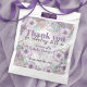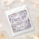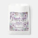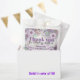 Dies ist eine charmante, individuell anpassbare Baby Dusche Gefallen-Tasche. Der Hintergrund der Tasche ist mit einem aufwändig handgezeichnet Blumendesign geschmückt, das eine lebendige und gleichzeitig zarte Kulisse schafft. Die blühenden Blume sind detailliert und abwechslungsreich, in verschiedenen Farbtönen lila, lavender, grün und weiß gestrichen. Dieses wunderschöne Blumenmuster Set ist ein Ton von Eleganz und Feier, perfekt für eine Babydusche. In der Mitte des Tellers wird der Satz "Danke" elegant in fett geschriebenen Buchstaben geschrieben. Dieser Satz bietet eine thematische Verbindung zwischen den blühenden Blume und dem erwarteten Wachstum der neuen Ankunft und fügt dem Design eine Touch von Launen hinzu. Unterhalb dieses zentralen Textes gibt es einen Raum, um die Tasche nach Ihren Wünschen anzupassen.