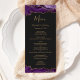 Dieses elegante, moderne Hochzeitsmenü besticht durch die lila Aquarellwand mit vergoldetem Imitat-Glitzer. Der Text erscheint in goldfarbener Handschrift, kursiv und kopperplate Schriftart auf schwarzem Schieferboden. Das agate Design wird auf der Rückseite wiederholt.
