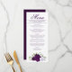 Dieses schöne Menü wird Ihrem Hochzeitsempfang etwas mehr Stil verleihen. Es zeichnet sich durch ein wunderschönes, schicke Blumendesign aus, mit handgemalten Aquarellfarben-Rose in staubigen lila-, Pflaumen- und Lavendeltönen, sowie mit Zierpflanzen aus Eukalyptus-Blätter und Gartengrün. Es gibt Platz für die Namen des Paares und das Hochzeitstag, und der Text ist vollständig anpassbar.
