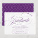 Feiern Sie den Absolventen stilvoll mit diesen lila Graduierteneinladungen, die in einem modernen Kalligraphieskript "Graduate" enthalten sind. Personalisieren Sie diese schicken Abschluss lädt mit dem Namen des Absolventen, Abschluss Jahr, Schulname und Party Details. Das trendige Design kehrt zurück, um ein stilvolles, weißes Trellis-Muster auf einem lila Hintergrund zu präsentieren, was diese Einladungen perfekt für Highschool- und Uni-Abschluß-Feiern macht.
