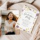 Elegante blumengeschmückte Partyeinladungen mit Details Ihrer Abschlussfeier, gerahmt von Aquarellfarben-Blume in lila und gelben Farbtönen mit üppigem grünem Blattwerk. Auf der Rückseite des Einladens wird Ihr vertikal vollblutendes Foto angezeigt. Der gelbe und lila Abschluss mit Blumen lädt sowohl für Absolventen der Highschool als auch für Absolventen der Uni ein.