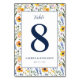 Diese elegante Hochzeitstischkarte verfügt über ein symmetrisches Layout mit einem Blumenrand in sanften Pastellfarben von hellorange, Lavendel, blassem Gelb und gedämpftem Blau. Das zentrale weiße Rechteck hebt die fett gedruckte, marineblaue Zahl "8" hervor, umgeben von zarten Gänseblümchen und Mohnblumen, wodurch ein natürliches und organisches Gefühl entsteht. Das Design kombiniert Kursiv- und Serifenschriftarten für eine anspruchsvolle Note, perfekt, um Ihrem besonderen Tag ein launisches, aber formelles Element hinzuzufügen. Ideal für Hochzeiten, erfasst diese Karte die Essenz der Feier mit ihrer harmonischen Mischung aus strukturiertem Text und botanischen Illustrationen.