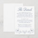 Versehen Sie Ihre Gäste mit wichtigen Hochzeitsinformationen in zeitlosem Stil mit dieser Hochzeitsdetails-Karte mit Navy-Ornamentrahmen. Der tiefe marineblaue Blumenrahmen verleiht klassische Tiefe und Struktur und schafft ein gepflegtes Aussehen, das sich perfekt zu formellen Zeremonien, Küstenlocations und traditionellen Hochzeitsthemen eignet. "Die Details" wird oben in eleganter Kalligrafie präsentiert, während Ihre Unterkünfte, Empfangsinformationen und Hochzeitswebsite unten in raffinierter Serifenschrift für ein ausgewogenes und anspruchsvolles Layout dargestellt werden. Diese Einlagekarte für Hochzeitsdetails ist so konzipiert, dass sie nahtlos mit Ihrem passenden marineblauen Einladungsset koordiniert werden kann und bietet eine elegante und organisierte Möglichkeit, alles mitzuteilen, was Ihre Gäste wissen müssen.