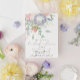Eine hübsche Braudusche mit einer Kaskadenanordnung aus pastellfarbenen Blume und Blätter in Lila, Rosa und Grün auf weißem Hintergrund. "Brautparty" ist in mauvem modernen kalligraphischen Schriftart. Personalisieren Sie Ihre Events in dunkelgrau und lila Schriftart. Die Rückseite ist in Massiv gehalten.