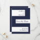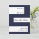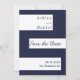 Diese elegante, blau-weiße Hochzeit spart die Dattelkarte für eine moderne Hochzeit und das schlichte Design zeichnet sich durch elegante blaue Kalligraphie auf weißen Streifen auf marineblau-blauem Hintergrund aus.