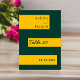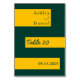 Die elegante Tischnummer in Grün und Gold eignet sich ideal für eine moderne Hochzeit und bietet eine elegante grüne Kalligraphie auf goldenen Streifen auf grünem Hintergrund.