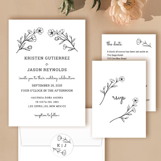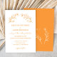 Eine einfache und süße Einladung zur Hochzeit. In atemberaubender orangefarbener Sonnenuntergangsfarbe können Sie handgezeichnete botanische Elemente bewundern. Sehen Sie sich die anderen passenden Artikel in der Wildblume Wedding-Kollektion an.