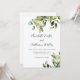 Diese elegante und minimalistische Hochzeitseinladung beinhaltet wunderschöne Aquarelltöne, andere Grünpflanzen, Botanicals und Blattwerk in verschiedenen Tönen und Grüntönen. Elegante Skriptkalligraphie für die Namen des Paares und einfache, leicht lesbare Serif-Schriftart für die Einzelheiten der Hochzeitsfeier.