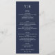 Vervollständigen Sie Ihre Hochzeitsnacht mit dem eleganten Minimalistischen Blue Wedding Menu. Dieses raffinierte Menü mit einem dunkelblauen Hintergrund und knalligem weißem Text bietet Platz ganz oben für die Initialen der Paare, gefolgt von gut organisierten Sektionen für Vorspeisen, Salate, Vorspeisen und Desserts. Am unteren Ende des Raumes können Sie sich mit den Namen der Braut und des Bräutigams und dem Hochzeitstag persönlich gestalten. Dieses Menü, das sich perfekt für moderne, formelle oder klassische Hochzeiten eignet, verbindet Eleganz und Einfachheit und macht Ihren Empfang elegant und unvergesslich.