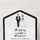 Diese elegante Schwarzweiß-Bogenhochzeit lädt zu einer modernen Hochzeit ein. Das einfache Design zeichnet sich durch eine elegante schwarze Kalligraphie und eine Braut- und Bräutigam-Illustration auf einem sauberen, weißen Hintergrund aus.