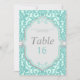 Elegante Minze und Gray Tischnummer Card. Dieses mit Meeresgrün, Aqua & Grau und antiken Spitzen gestaltete Design eignet sich hervorragend für elegante und traditionelle Hochzeiten. Weitere Hochzeitslieferungen sind bei MetroEvents auf Zazzle erhältlich. Entworfen von Metro-Events.com
