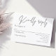 Diese elegante und moderne Antwortkarte besticht durch dunkelgraue Schrift auf weißem Hintergrund. Wir benutzten eine Kombination aus eleganter klassischer Schrift, gepaart mit einer modernen Kalligraphiebriefe.Eine schöne, einfache und anpassbare Antwortkarte, die für das moderne Paar auf der Suche nach Eleganz und Einfachheit entworfen wurde. Diese wunderschön gestaltete Karte zeichnet sich durch einen sauberen, raffinierten Look in zeitlosem Design aus.