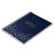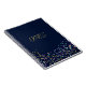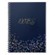 Ein modernes, elegantes Notebook mit dunkelblauem Hintergrund und Konfetti in goldenen, lila, rosa, grünen und blauen Farbtönen. In Skript Gold Typografie Notes ist in der Mitte des Notebooks geschrieben. Ideal für den Rückweg zur Schule, ins Büro oder zum allgemeinen Gebrauch im Zuhause.