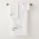 Dieses elegante, schwarzweiße Handtuchhandtuch-Set mit moderner Typografie kann mit Ihrem Namen und einem besonderen Datum personalisiert werden. Entwickelt von Thisisnotme©