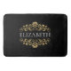 Eine elegante Schwarz-Gold-Badematte blühe Monogramm. Fügen Sie Ihren Namen zwischen den goldenen Blüten auf der Vorderseite geblüht. Entworfen für Sie von BlackBerry Boulevard.