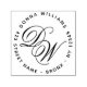 In der Mitte befindet sich ein Monogramm, das aus 2 Initialen besteht, die in einem eleganten Kalligraphieskript geschrieben sind. Sie sind umgeben von dem Namen und der Adresse, in einem Kreis geschrieben, mit Kappen, dem Namen oben, der Adresse unten.