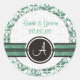 Elegante Monogram Damask Save the Date Hochzeitskleber. Mit diesem eleganten Monogram Damask Save the Date Hochzeitskleber machen Sie einen bleibenden Eindruck. Auf dem Aufkleber ist ein Streifen und auf ihm ein Kreis mit einem eleganten Monogramm. Der schöne, grün-weiße Damast-Hintergrund verleiht Stil und Finesse. Entworfen von Olympia. Klassisch und raffiniert zugleich aber zeitgemäß. Design in verschiedenen Farben erhältlich. Personalisieren Sie es mit Ihrem Text. Sie können den Text ändern und ihn als Dankeschön-Aufkleber oder jede andere Verwendung verwenden, die Sie denken.