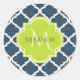 Elegant marineblaue Quarrefolie gemusterte Aufkleber mit einem geschmolzenen Abzeichen in einem lebendigen Frühlinggrün, dass Sie personalisieren können, indem Sie Ihren Namen und mit Monogramm erste zu. Dies ist Teil der Sailor Blue und Limon Punch Spring Kollektion.