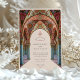 Feiern Sie die Liebe mit dieser exquisit gestalteten islamischen Hochzeitseinladung. Die lebhaften Blumenmuster in rubinroten Farbtönen, Korallenrosa, Pastellpfirsich und aquamarinem Blau verleihen den Arkaden eine faszinierende Mischung aus islamischer Architektur und Jugendstil-Ästhetik. Feine Blumendetails wie Sonnenblumen, Dahlien und arabische Motive schmücken die Gewölbedecken und Säulen und schaffen ein Meisterwerk, das Einheit und Tradition symbolisiert. Die verzierte Schrift und der weiche beige Hintergrund sorgen für eine Touch zeitloser Eleganz und sind ideal für Paare, die ein kulturell inspiriertes Hochzeitsthema suchen.