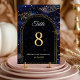 Mit dieser eleganten mystischen Celestial Wedding Tischnummer in Schwarz und Gold können Sie Ihre Gäste im himmlischen Stil begleiten. Mit einem blauen Hintergrund mit schimmernden Imitaten, goldenen Sternen und kosmischen Akzenten bringt jede Tischnummer eine Touch von Mystik und Eleganz in Ihren Empfang. Die raffinierte Goldtypografie sorgt für Lesbarkeit und verleiht Ihren Tischeinstellungen ein luxuriöses Glühen. Dieses Design ist perfekt für eine Sternenfeier, inspiriert Mond oder himmlische Themenfeier geeignet und verbindet Romantik und Zauber unter den Sternen.