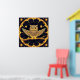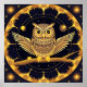 Stilisierte Abbildung einer Nachteule, die auf einem Ast inmitten von goldenen und blauen Mustern steht und ein magisches und mystisches Ambiente hervorruft, das sich ideal für dekorative oder künstlerische Zwecke eignet.