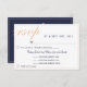 Persönliche elegante RSVP Karte mit Menüwahl für eine Hochzeit. Es ist perfekt für eine moderne und elegante Hochzeit. Der Text ist in einem modernen Skript und in einer Pfirsichfarbe. Der Hintergrund ist in Mitternachtsblau. Diese Hochzeitskarte frage Ihren Gästen, was sie am Empfang essen möchten und wie viele Menüs sie haben möchten. Sie können die Informationen auf der Karte nach Ihren Wünschen ändern. Diese RSVP-Karte passt zu allen Artikeln in der Gelben Rosa Mitte der Nacht blauen Hochzeitskollektion, die Sie unter dieser Karte finden können.