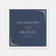 Dieses Hochzeitsservietten-Design verfügt über ein minimalistisches und elegantes Layout mit tiefblauem Hintergrund, wodurch es ein anspruchsvolles und zeitloses Aussehen erhält. Der zentrale Text ist in einer sauberen, modernen serifenlosen Schrift für die Namen angeordnet, ergänzt durch eine stilvolle kursiv geschriebene Schrift für "und", während das Datum in einer kleineren Serifenschrift dargestellt wird, was einen formellen Touch hinzufügt. Geometrische Dekorationselemente in den Ecken weisen einen Art Deco-Einfluss auf, wodurch die allgemeine Symmetrie und Balance verbessert werden. Die knackig weißen Akzente kontrastieren schön mit dem marineblauen Hintergrund und sorgen für Lesbarkeit und visuelle Wirkung, wodurch es perfekt für eine verfeinerte und luxuriöse Hochzeitsfeier ist.