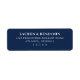 Dieses Rücksendeetikett verfügt über ein anspruchsvolles, minimalistisches Design mit tiefblauem Hintergrund und knackigem weißen Text. Das Layout ist sauber und organisiert und nutzt ausreichend Abstand, um die elegante Serif-Typografie hervorzuheben, die Formalität und Raffinesse vermittelt. Perfekt für formelle Anlässe, kombiniert dieses Etikett Einfachheit und Raffinesse und ist daher ideal für Hochzeiten oder andere besondere Ereignisse, bei denen Klarheit und Eleganz unerlässlich sind.