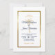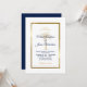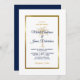 Mit dieser eleganten Einladung mit modernem Drehbuch, marineblau-goldfarbenem Text, inklusive einer künstlerischen Palme und einem metallischem Goldrahmen auf der Vorderseite der Karte, laden Sie Ihre Gäste ein, Ihren besonderen Tag zu feiern. Auf der Rückseite ist ein marineblau Hintergrund.