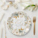 Elegante neutrale Bläserblütenbabydusche Teller mit wunderschönen Blume aus Gold, Weiß und Blau, Grün und moderner Kalligraphie.