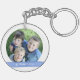 Trendy, personalisierte neue Baby Girl Schlüsselanhänger mit einem weißen Rahmen mit einer runden Öffnung für ein maßgeschneidertes horizontales Foto, und einem abgerundeten rosa Band, auf dem der Name oder die Namen des Kleinen in einem eleganten Drehbuch Schriftart / Typografie erscheint. Auf der Rückseite ist das gleiche Design mit einem Foto der Geschwister des Mädchens und einer blauen Band mit ihren Namen (vorausgesetzt, dass mindestens eines ihrer Geschwister ein Junge ist; wenn sie nur Schwestern hat, sehen Sie bitte dieses Design: https://www.zazzle.com/elegant_cute_new_baby_girl_sisters_photos_keepsake_keychain-256230472833962356). Wenn Sie gewollt haben, können Sie diesen Schlüsselanhänger Single-seitig kaufen.