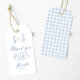 Mit diesen charmanten Dankeschön-Anhängern für eine Frühjahr- oder Sommerbabydusche, die mit einem reizvollen pastellblauen Gingham-Muster inspiriert von einem französischen Thema.
