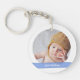 Trendy, personalisierter, neuer Baby-Junge-Schlüsselanhänger mit einem weißen Rahmen mit einer runden Öffnung für ein maßgeschneidertes horizontales Foto, und einem abgerundeten rosa Band, auf dem der Name oder die Namen des Kleinen in einem eleganten Drehbuch-Schriftart / Typografie erscheint. Auf der Rückseite ist das gleiche Design mit einem Foto der Schwestern des Babys und einer rosa Band mit ihren Namen (wenn mindestens eines seiner Geschwister ein Junge ist, sehen Sie bitte dieses Design: https://www.zazzle.com/elegant_cute_new_baby_boy_siblings_photo_keepsake_keychain-256058593140469368). Wenn Sie gewollt haben, können Sie diesen Schlüsselanhänger Single-seitig kaufen.