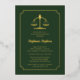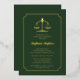 Eine Bibliotheka rechtliche Waage der Gerechtigkeit und skallopierte Rahmen Goldfolie und grüne Graduierungspartei Einladung Design, die für Recht oder andere rechtliche Feld Schule Abschluss personalisiert sein kann. Composite Design von Holiday Hearts Designs (Rechte vorbehalten).