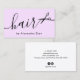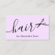 Dieses moderne, hairstylistische Visitenkartendesign besticht durch eine schwarze Schere, einen pastellfarbenen lila Hintergrund und einen eleganten Kalligraphie-Schriftart.