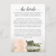 Diese wunderschöne Hochzeitszimmerkarte ist so konzipiert, dass Sie mehr Platz für alle Informationen haben, die Ihre Gäste benötigen, wie z.B. Website, Registrierung, Empfang, Reise, Unterkunft oder andere Details. Die Karte zeichnet sich durch ein wunderschönes Design aus, mit einem Single, der die pfirsichfarbene Rose des Elfenbeins wiedergibt, und einem laksigen Schriftzeichen, der "die Details" liest. Die Rückseite ist in einem blassorangefarbenen Marmor gehalten.