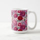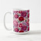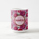 Rote Rosen, rosafarbene Pfannkuchen und lila Lilien auf weißem Hintergrund schaffen eine wunderschöne Tasse mit Vintagem Look. Ein rundes Abzeichen mit Rand und Mitte in komplementären Farben hat Platz für Ihren Namen und Ihre Monogramm.