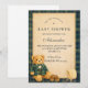 Ein charmantes, preppy Baby-Shower-Design mit einem süßen Teddybären, der eine klassische grüne Karo-Jacke und eine Fliege trägt. Über dem Bären zeigt eine zarte Wäscheleine winzige Babykleidung und Schuhe und schafft eine nostalgische Szene aus einem Bilderbuch-Kinderzimmer. Der dunkelblaue Hintergrund und der subtile Tartan-Rahmen verleihen dem Ganzen eine raffinierte, vintage-inspirierte Note, die sich sowohl elegant als auch verspielt anfühlt. Perfekt für eine stilvolle Baby-Shower-Feier mit klassischer, preppy-Ästhetik.