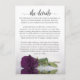 Diese wunderschöne Hochzeitszimmerkarte ist so konzipiert, dass Sie mehr Platz für alle Informationen haben, die Ihre Gäste benötigen, wie z.B. Website, Registrierung, Empfang, Reise, Unterkunft oder andere Details. Die Karte weist ein wunderschönes Design auf, mit einem Single, der die lila Rose der Pflaume reflektiert, und einem laksigen Schriftzeichen, der "die Details" liest. Der Rücken ist lila oder violett mit Marmor ausgelegt.