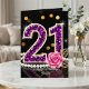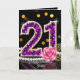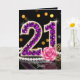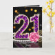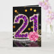 Feiern Sie ihren besonderen Meilenstein stilvoll mit dieser luxuriösen Geburtstagskarte zum 21. Die Karte ist perfekt für die junge Frau, die eine Berührung von Glamour liebt. Das Kunstwerk zeigt eine funkelnde "21", gefüllt mit falschen violetten Diamantsteinen und mit Gold verziert. Die elegante Komposition wird durch eine klassische Schnur weißer Perlen, goldene Filigran-Blätter und eine zarte rosa Rose vor einem eleganten schwarzen Hintergrund mit festlichen Bokeh-Lichtern betont.