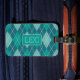 Eine stilvolle Raute von Diamanten, die durch eine weiße Naht mit dem kurzen Namen oder den Initialen in einer koordinierenden Zentrale durcheinander gebracht wird. Diese Variation in aquamarinen Farbtönen verleiht diesem traditionellen Modedruck einen modernen Look.