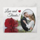Diese wunderschöne Postkarte ist eine einfache, aber nachdenkliche Möglichkeit, Ihren Hochzeitsgästen zu danken. Es zeichnet sich durch ein hübsches Design aus, mit Ihrem Foto in einem ovalen Rahmen, und einem Single lang gestempelt rote Rose reflektiert in einem Pool von Wasser. Die Beschriftung lautet "Liebe und Dank" und es gibt Platz für Ihre eigene Notiz auf der Rückseite sowie Ihre Unterschrift.