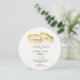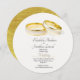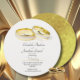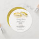 Eine elegante Einladung mit Hochzeitsringen, die der Einladung ein sehr traditionelles Gefühl verleiht. Die Ringe sind auf einem schlichten, weißen Hintergrund mit der Typografie in einem modernen Schriftart. Der Schriftart ist wieder ganz in Schwarz. Ein goldfarbenes Bar unterstreicht das Wort Hochzeit. Die Rückseite der Einladung ist in einer goldenen Farbe. Die Einladung ist einfach an Ihre Informationen anpassbar.