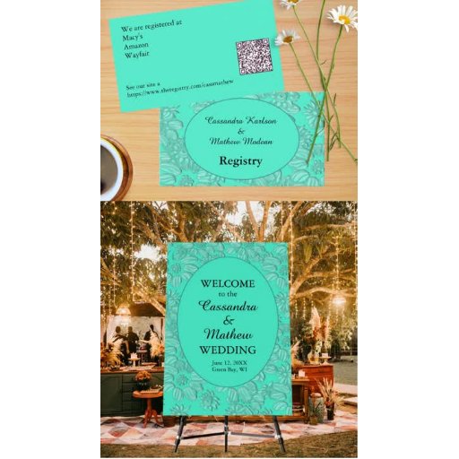 Diese türkisfarbenen Hochzeitsprodukte sind mit eleganten, 3D-ähnlichen Gängen und einem lichtdurchlässigen Hintergrund versehen, um Ihre bevorzugte Farbe zu zeigen. Der mittlere Bereich zeigt einen soliden Kreis mit den Namen des Paares und ihrem Hochzeitsdatum auf der Vorderseite. Die Rückseite hat nur das Design. Passen Sie die Farbe des Hintergrunds an, wenn Sie ihn bearbeiten.