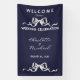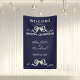 Dieses elegante romantische Hochzeits-Willkommensbanner mit Marineband und -schleife ist mit weißem Text auf marineblauem Hintergrund mit weißen Schleifenakzenten gestaltet. Der Vordertext enthält: Willkommen zur unserer Hochzeitsfeier, die Vornamen von Braut und Bräutigam und das Hochzeitsdatum. Zur Personalisierung fügen Sie einfach Ihren Text in unsere einfache Vorlage ein und ersetzen den Beispieltext. Sehen Sie sich sicher auch das passende Hochzeits-Gratulationsbanner, die Hochzeitseinladung, die "Save The Date"-Anzeige und mehr an.