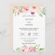 Vibrierende Aquarellblütenblüten, rosa Blumen und zartes grünes Blattwerk, formelle Einladung zur Hochzeit. Moderne und elegante Typografie-Designvorlage. Die Rückseite der Karte ist mit einer massiven, cremefarbenen Farbe versehen, die individuell angepasst werden kann.