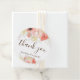 Rose in den Farben Korallen, Rosa, Lachs und Schokolade sind mit goldenen Blätter angereichert. "Vielen Dank" zusammen mit den Namen des Paares und das Hochzeitstag wird in dunkelschokoladenbraunen kursiven und traditionellen Schriftart, um das Blumenstrauß ergänzen. Die Rückseite des Tags kann mit einer speziellen Nachricht an Ihre Gäste angepasst werden.