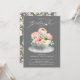 Schönes rosa Blumenstrauß in einem grauen Teetasse-Set auf grauem Hintergrund für ein Party zum Geburtstag. Dreh unsere Einladung zu einem koordinierenden Blumenbacken für eine besondere Touch.